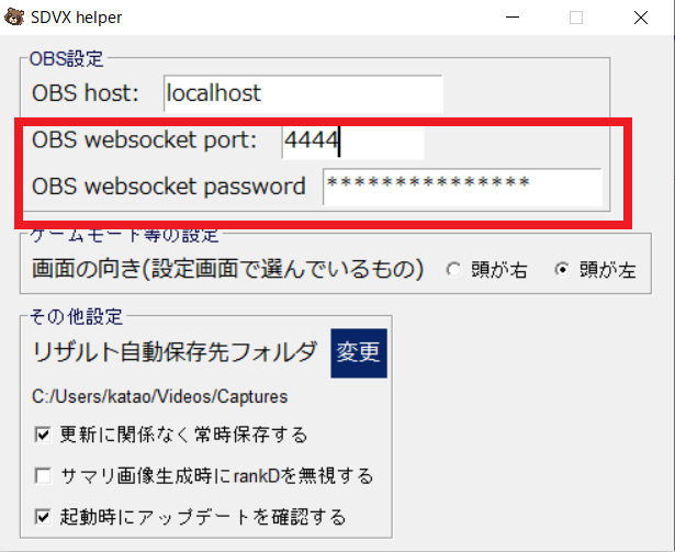 必要に応じて設定してください。4.で設定するパスワードや5.で作成するゲームキャプチャソースの名前をsdvx_helperに設定する必要があります。