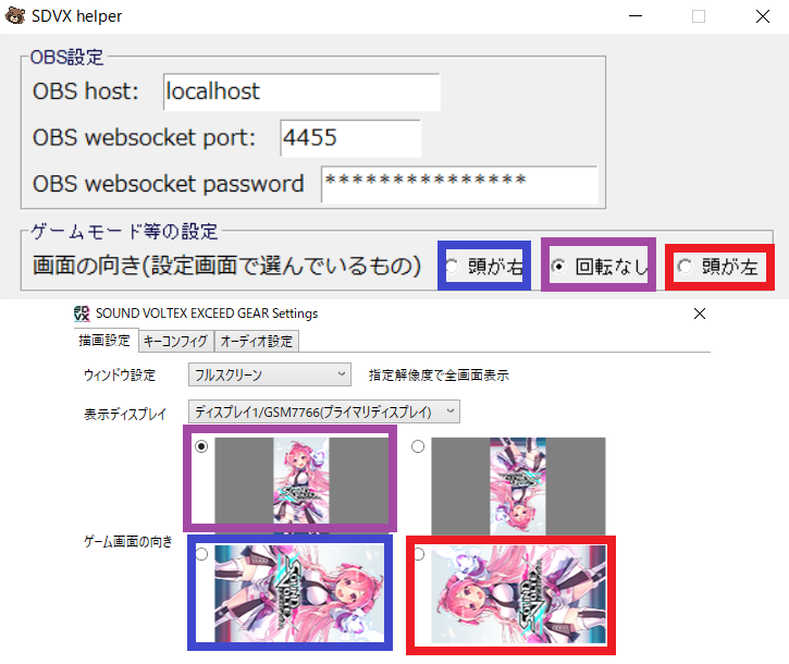 - 以下の画像を参考に、コナステ版SDVXの設定画面で指定している画面の向きを選択する。