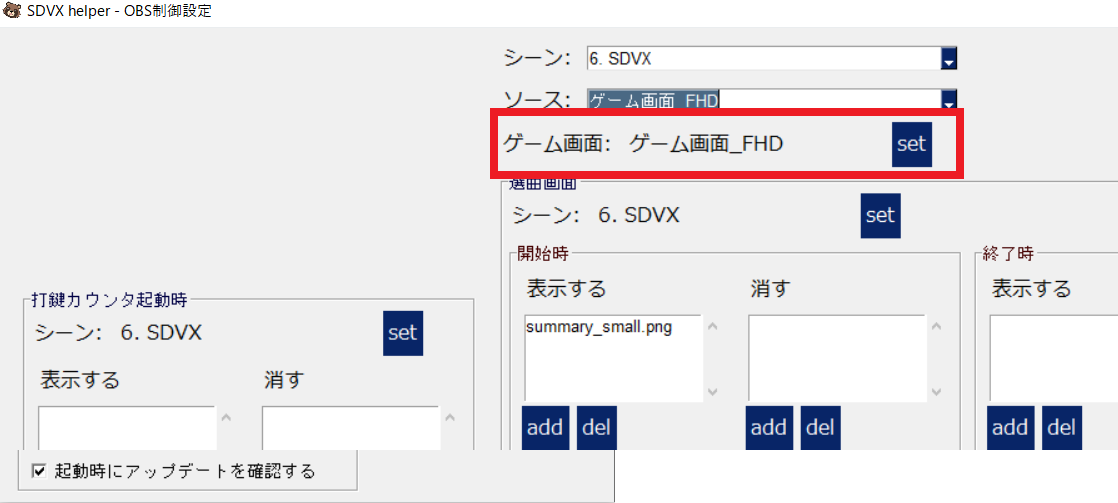 - ソース欄からゲーム画面のキャプチャに使うソース(上記で作成したもの)を選択し、ゲーム画面の横にあるsetボタンをクリックする。