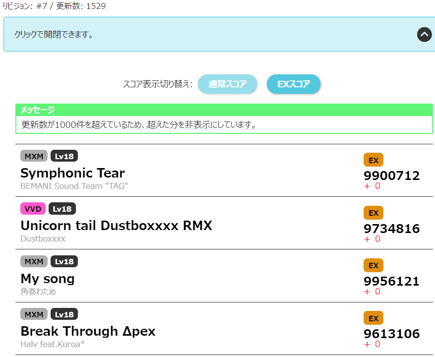 アクセストークンの設定ができていれば、sdvx_helper終了時にその日の成果がsdvx_helper portalへ送信されます。送信されたデータはマイページのスコア関連のセクションから確認することができます。