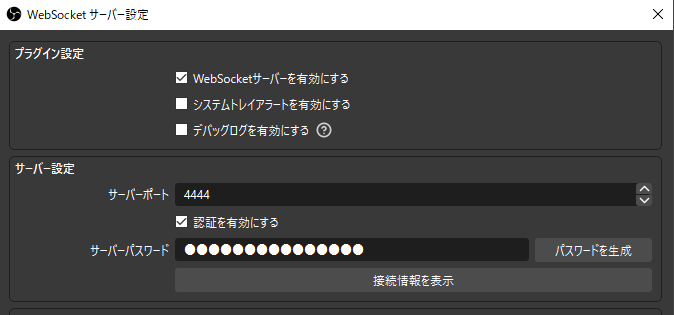 - 設定画面でOBS側のWebsocket設定と同じポート番号及びパスワードを入力する。